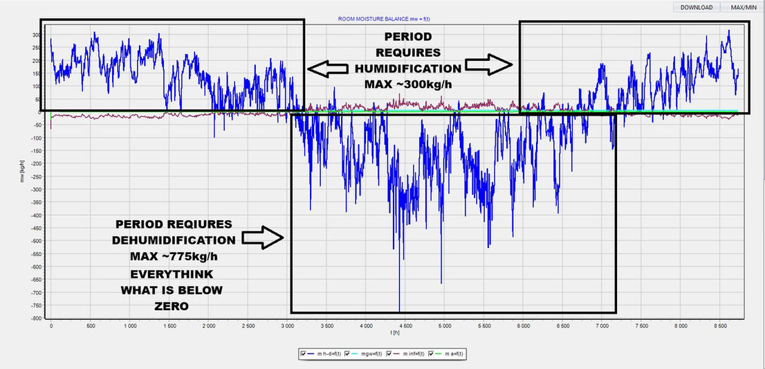 We can immediately see what the relative humidity in the room will be - in this case RH=44.27%, and what the required cooling capacity of the air conditioning system is - in this case 2871kW.